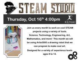 Join us every month to work on cool STEAM projects using a variety of tools. STEAM stands for Science, Technology, Engineering, Art, Mathematics. This month we will be using Artie3000, a drawing robot that we can program to make cool art. Designed for a variety of experience levels ages 8 to 14.